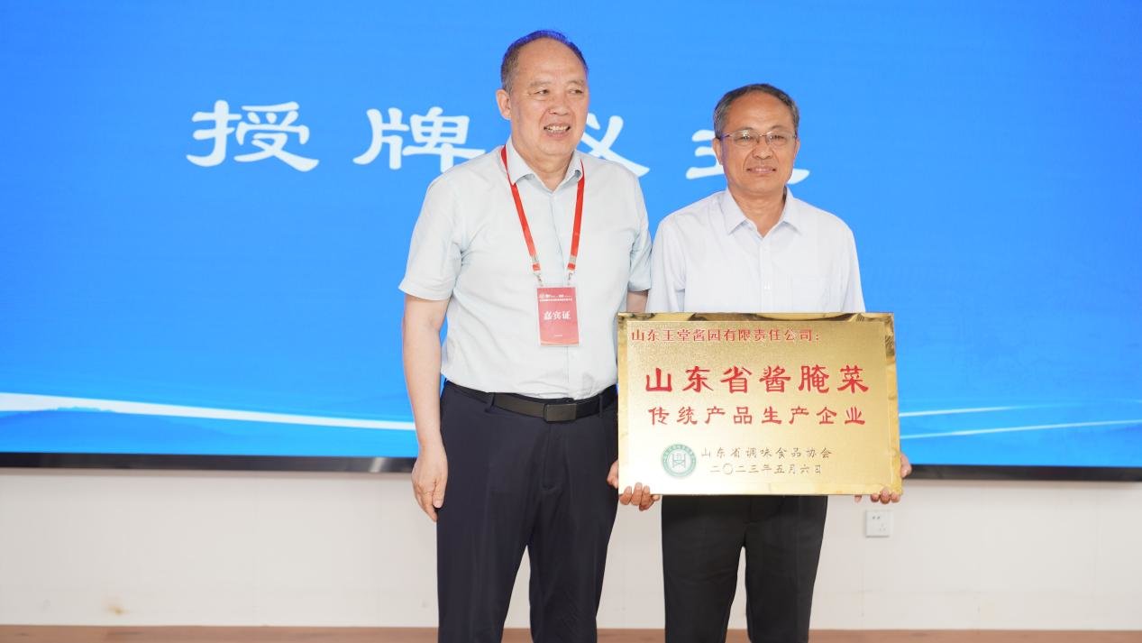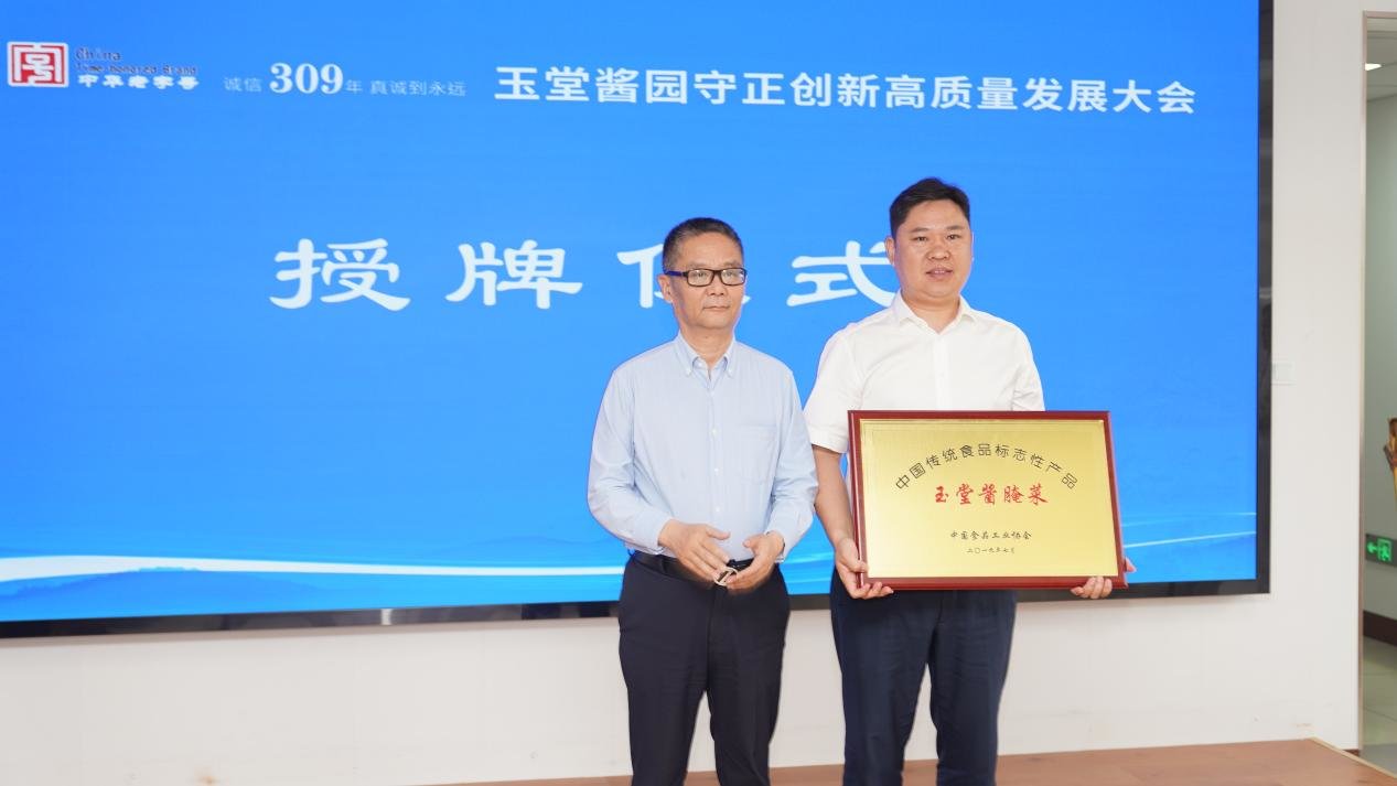由山东省调味食品协会会长杨圣泉颁发《山东省酱腌菜传统产品生产企业》,玉堂酱园副总经理孙彬接牌。