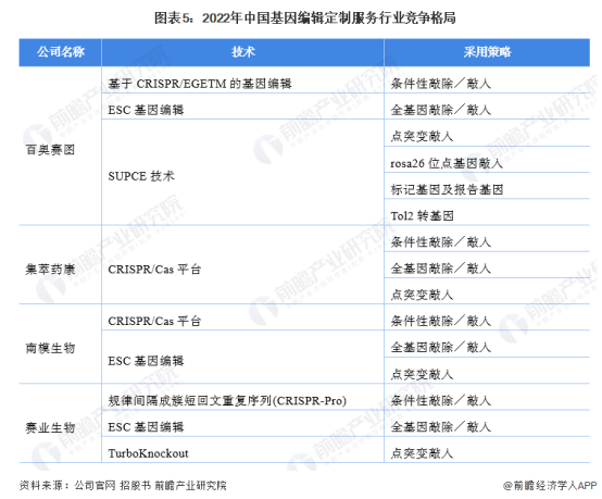 目前我国提供基因编辑的实验动物企业主要有百奥赛图、集萃药康、南模生物和赛业生物等。其中,这四家公司以CRISPR技术和ESC基因编辑技术展开基因编辑定制服务业务。