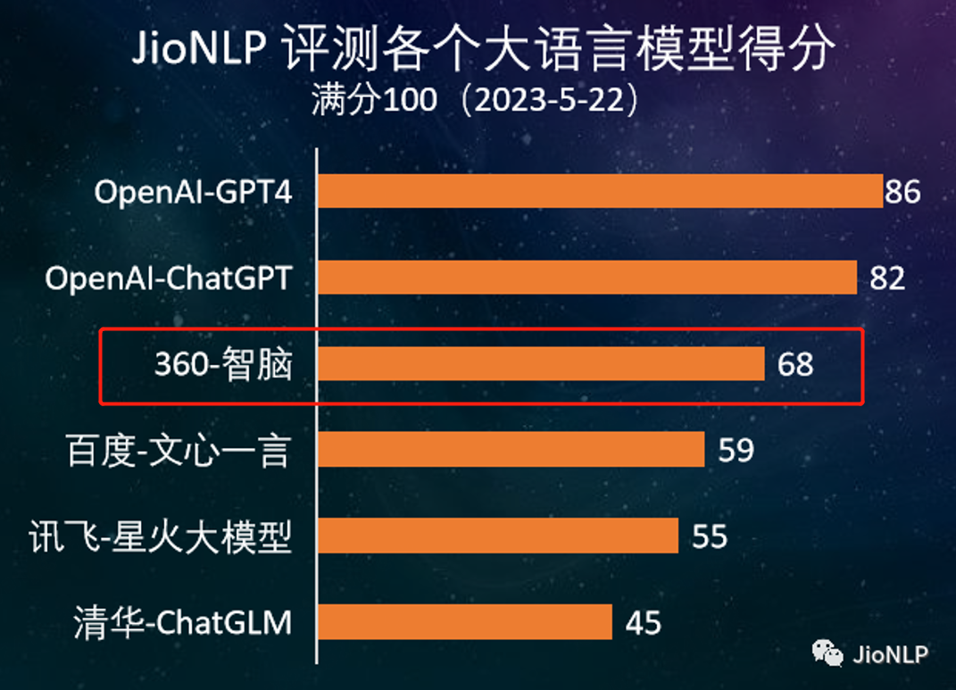近期国内众多公司的大模型产品集中涌现,为把所有公测大模型拉齐到同一个水平线上进行横向比较, JioNLP制作了一份大语言模型评测数据集,用于考察各个大语言模型的实际效果。在其最新一次评测结果中,360智脑得分68分,仅次于ChatGPT和GPT4,高于科大讯飞等国产大模型,属于国产大模型之首。