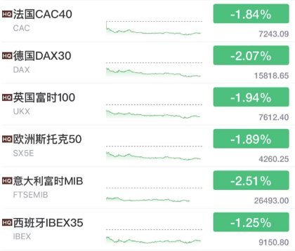 今夜,欧洲股市普遍大跌2%左右。 富时泛欧绩优300指数初步收跌1.88%。德国DAX 30指数初步收跌2.07%。法国股指初步收跌1.83%,意大利股指初步收跌2.49%,英国股指初步收跌1.97%。