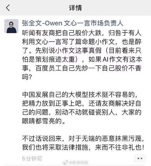 针对科大讯飞因AI小作文股价大跌一事,百度文心一言市场负责人张文全在朋友圈怒怼,称“听闻有友商把自己股价大跌,归咎于有人利用文心一言写了篇命题小作文,也是醉了。先别说小作文这事真假 (目前看来只怕是策划痕迹太重),如果AI作文有这本事,百度员工自己先炒一下自己股价不香吗?中国发展自己的大模型技术挺不容易的把精力放到正事上吧,还请友商解决好自己的问题,别动不动就碰瓷别人,大家的眼睛都雪亮的。”