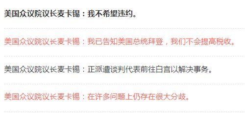 美国众议院议长麦卡锡表示,正派谈判代表前往白宫完成工作;依然在很多问题上分歧巨大;已经告诉拜登共和党不会同意加税;我不想要违约;我们今天可以取得进展;我们可以就债务协议达成一致。