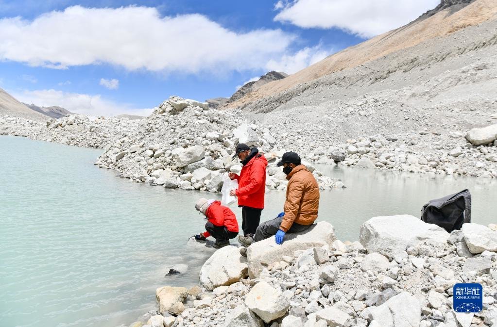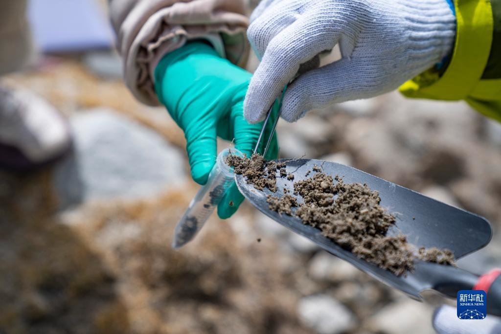 在珠峰登山大本营附近,来自西藏大学生态环境学院的科考队员在收集土壤样本(5月22日摄)。