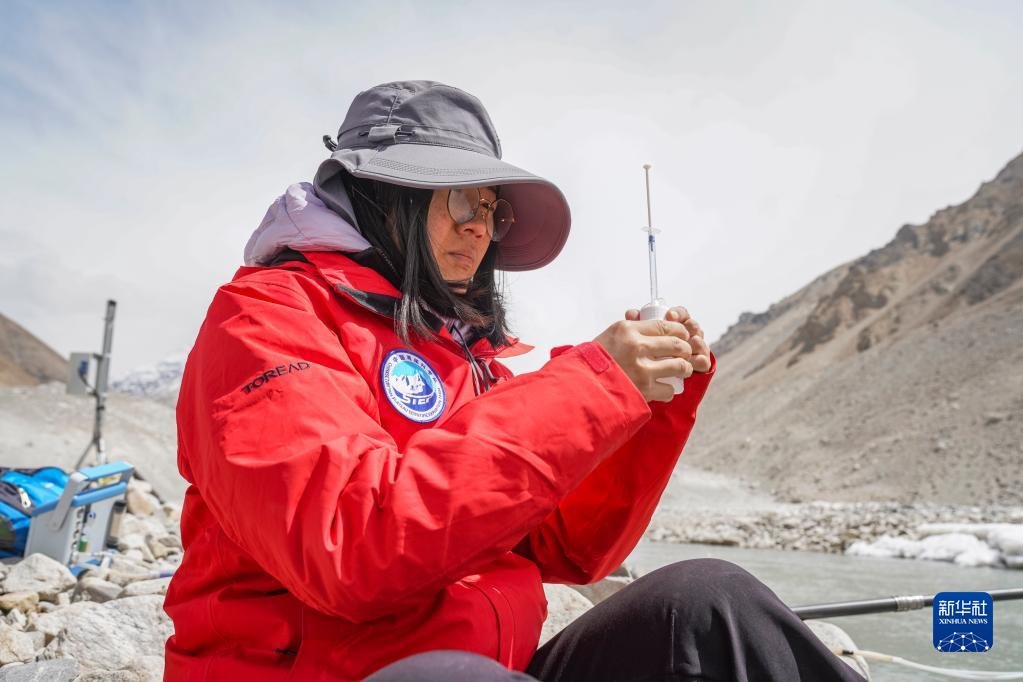 在珠峰登山大本营附近,来自中国科学院青藏高原研究所的科考队员邱海英在检测绒布冰川末端水质(5月14日摄)。