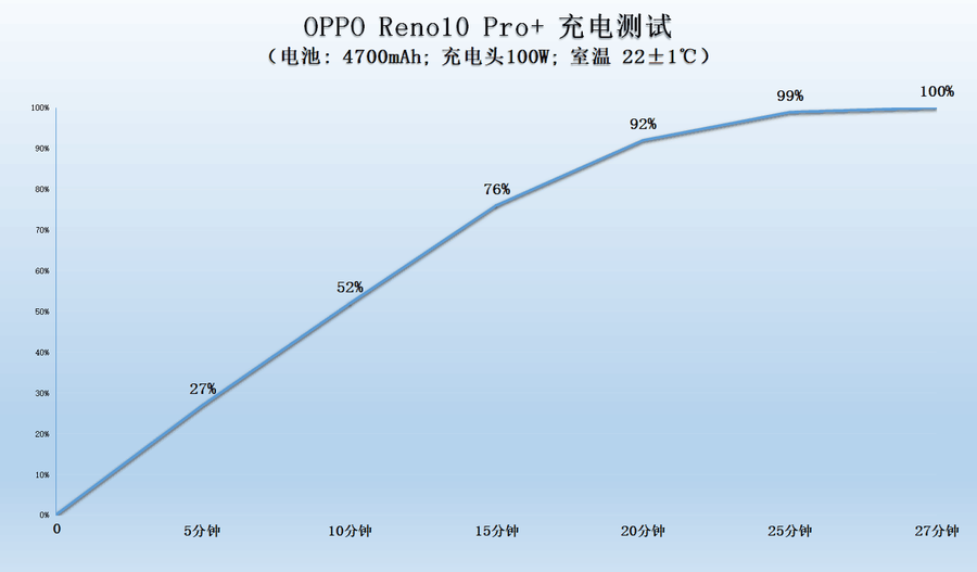 在室温22±1摄氏度的情况下,笔者对于OPPO Reno10 Pro+进行了充电测试,可以看到,凭借100W长寿命闪充技术的加持,OPPO Reno10 Pro+在短短的15分钟内就充入了52%的电量。而此款手机充电到显示100^%电量也只是花了27分钟,在半小时不到的时间内完成了手机的快速补电。使得用户即使是在夜间忘记充电的情况下,也可以在极短的时间段内为手机补充电量,作为无忧出门。