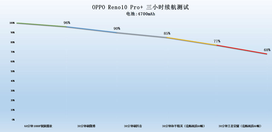具体的测试项目包括有1小时1080P B站在线视频播放、30分钟微博浏览、30分钟短视频浏览、30分钟《和平精英》(流畅画质+60帧)、30分钟《王者荣耀》(极 致画质+60帧)。笔者将在实际的体验后,查看搭载4700mAh大电池的OPPO Reno10 Pro+还剩下多少电量。