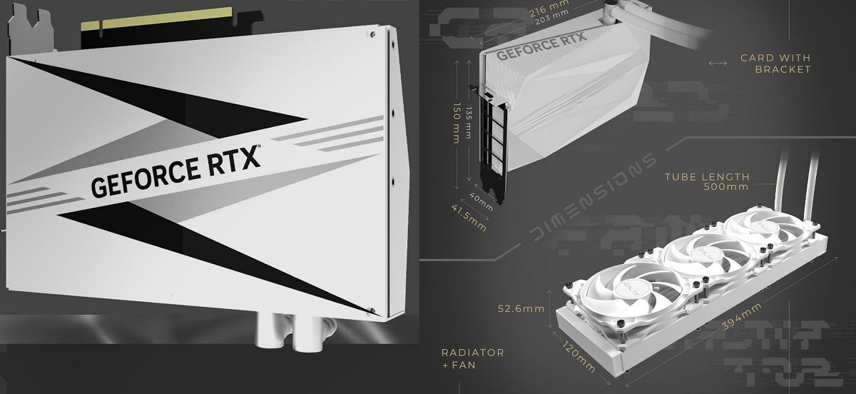 GeForce RTX 4090 Hydro系列没有像华硕的ROG Strix LC GeForce RTX 4090那样采用混合散热设计,卡上并没有风扇,而是依靠360mm水冷,配有三个120mm双轴承风扇,通过50cm长的导液管连接,水泵隐藏在显卡的保护罩下面。显卡采用全覆盖铝合金背板,长度为216mm,厚度为双槽,高度为15cm,PCB似乎用的是影驰的定制设计。