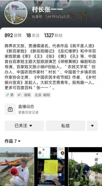 作家张一一新开通抖音账号“村长张一一”分享其归隐深山老林的田园生活。