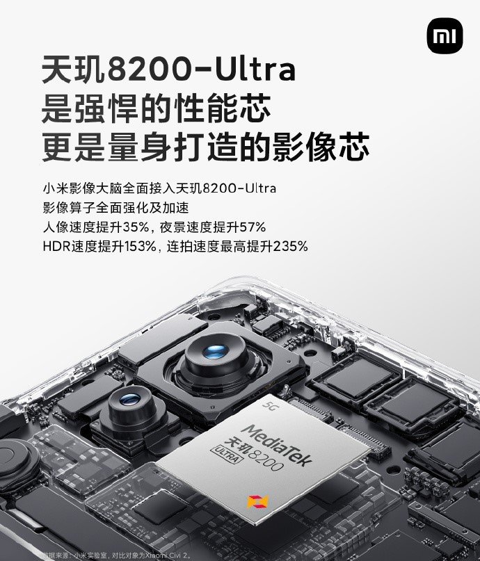 小米与联发科深度调教,带来全新“影像芯”天玑8200-Ultra,采用台积电4nm制程,并深度接入小米影像大脑,带来强劲性能的同时,还有芯片级别的影像实力全面强化与加速,覆盖人像虚化、人像超清、多帧降噪等多个核心算法,连拍速度相比上代提升235%。