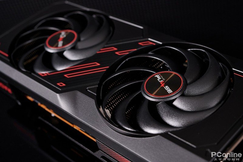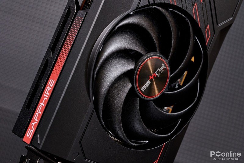 这张蓝宝石RX 7600白金版OC整体的设计语言依旧是我们经典的蓝宝石白金家族风格,黑武士的配色让这张显卡整体相当的低调和简约。中间红色线条和刻线,以及边缘的切边倒角等标志性的设计,让这张显卡不会显得过于单调,更具辨识度。