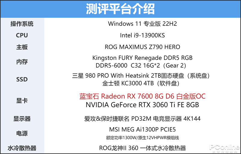 测试平台我们选择了Intel i9 13900KS,搭配ROG MAXIMUS Z790HERO主板,内存为两根DDR5-6000 C32 16GB组成双通道。测试全程在开放式平台进行,测试主角是蓝宝石 Radeon RX 7600 8G D6 白金版OC。