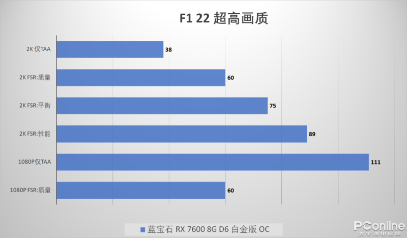 当然也别忘了,RX 7600也支持FSR 2技术的,所以我们也选择了两款支持最新FSR 2.2技术的游戏,来看看RX 7600开启FSR 2后游戏性能能有什么样的提升。整体测试下来,FSR 2.2的提升还比较有惊喜的,像《F1 22》在不开启FSR的情况下,帧率仅为60帧,开启FSR质量档后,帧率直接来到了111帧。同样在《极限竞速:地平线5》中,FSR也能带来不错的提升。