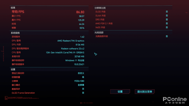 实测下来,RX 7600的游戏性能还是相当不错的,测试的几款3A游戏,大部分都能在最高画质的情况下跑到超过100帧的画质水平,即使是有着显卡杀手之称的《赛博朋克2077》也能跑到86.8帧的水平。