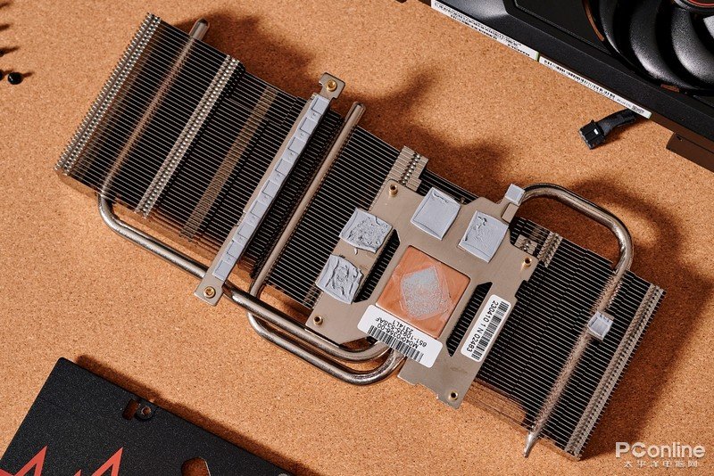 看到散热模组部分,蓝宝石RX 7600白金版OC采用了加厚鳍片加双镀镍热管的散热设计,对于一张TBP在165W的显卡来说,双热管基本够用了。散热模组采用铜底直触设计,显存和供电DrMos芯片上覆盖有高导热系数的硅脂,有效传导热量。