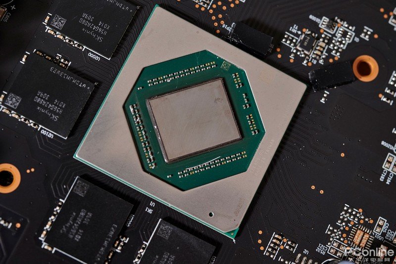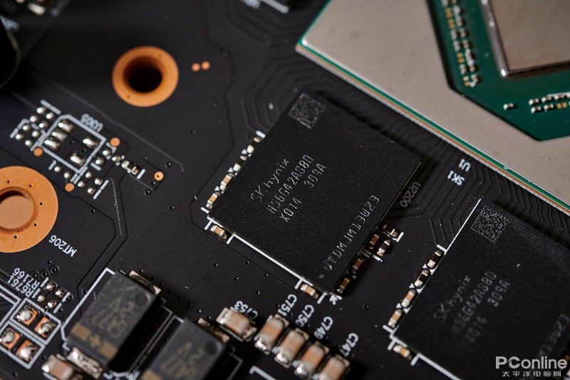 核心四周是四颗GDDR6显存颗粒,来自SK海力士,编号为H56G42AS8DX014,最高速率为18Gbps,单颗容量为2GB,位宽为32Bit,共同组成8GB显存,128Bit位宽。