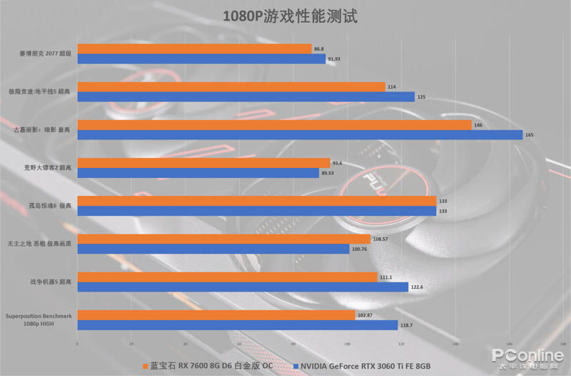 总体来看,RX 7600确实是一张不折不扣的1080P游戏显卡,能够在1080P高画质的情况下,流畅运行大部分的3A大作,各别优化一般的游戏,有FSR技术加持也能得到一个十分流畅的帧率表现,光栅化性能表现和隔壁家的RTX 3060 Ti十分接近。