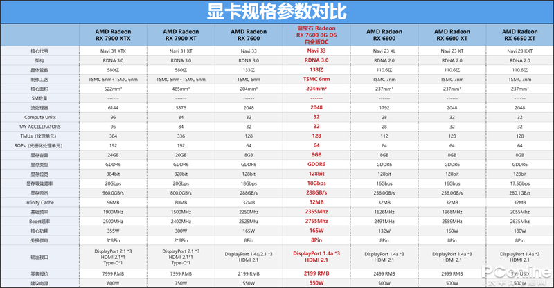 虽然没有用上和RX 7900XTX/RX 7900XT一样的TSMC 5nm工艺,相比上一代TSMC 7nm工艺的RX 6600,RX 7600核心面积从237mm2缩小到了204mm2,晶体管数量则从111亿提升到了133亿的规模。