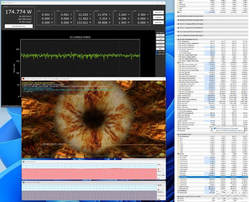 温度方面,RX 7600本就是一个6nm的小核心,散热压力并不算大,像这张蓝宝石RX 7600白金版OC的散热规模就能不错的温度控制,室温25°的情况下烤机30分钟,温度稳定在71°左右。同时我们利用PCAT工具可以监控到显卡在Furmark烤机时PCIe插槽功率为39.8W,而8Pin辅助供电供电为133W,整块显卡的TGP为174W。