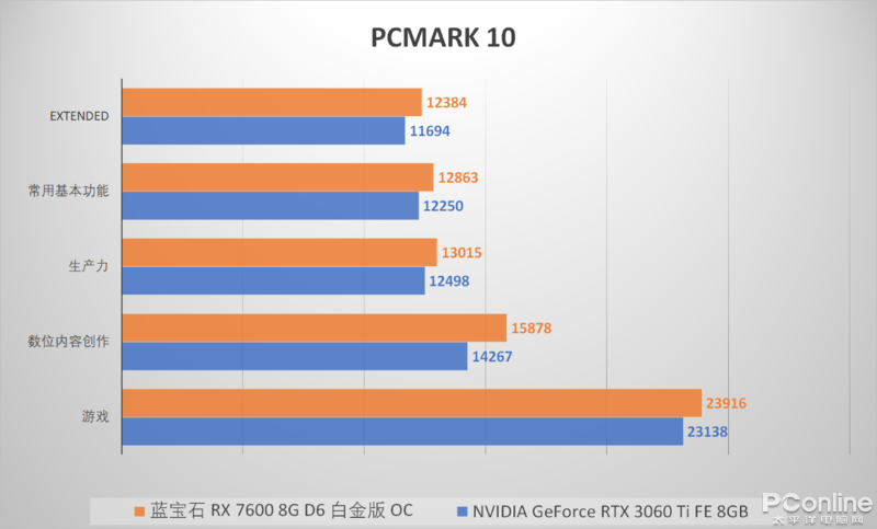 在CrossMark、PCMark 10、UL Procyon这三个项目上,RX 7600和RTX 3060 Tij的性能依旧是十分接近,可以说应对日常像Word、Excel这样的办公场景或是图片编辑、视频导出这样的轻度生产力场景,两张显卡的性能是没有差别的,属于都能轻松应对的水准。
