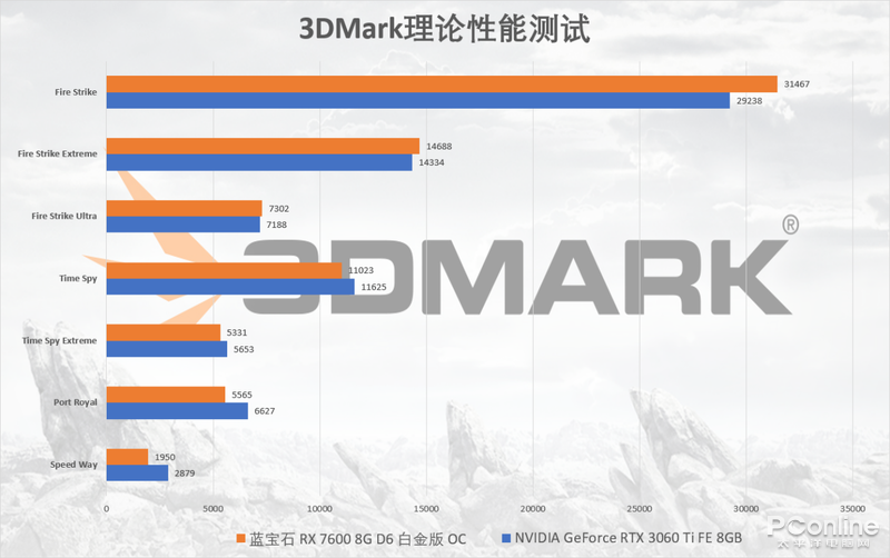 可以看到在反应DX11性能的Fire Strike测试中,RX 7600是全面领先对标的RXT 3060 Ti,在1080P分辨率下领先约7%左右。不过在反应DX12性能的Time Spy项目上,RX 7600则略微落后RTX 3060 Ti,落后幅度大约为5%左右。