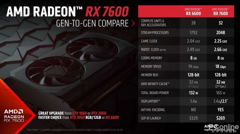 并且RDNA3架构也是升级到第二代的光追单元,从RX 7900XTX/RX 7900XT上的表现看,虽然第二代光追单元相比老黄家的还有一些差距,当是相比上一代提升已经是相当明显了,所以这次RX 7600虽然规格提升不大,但是光追性能应该还是会比上一代好不少的。
