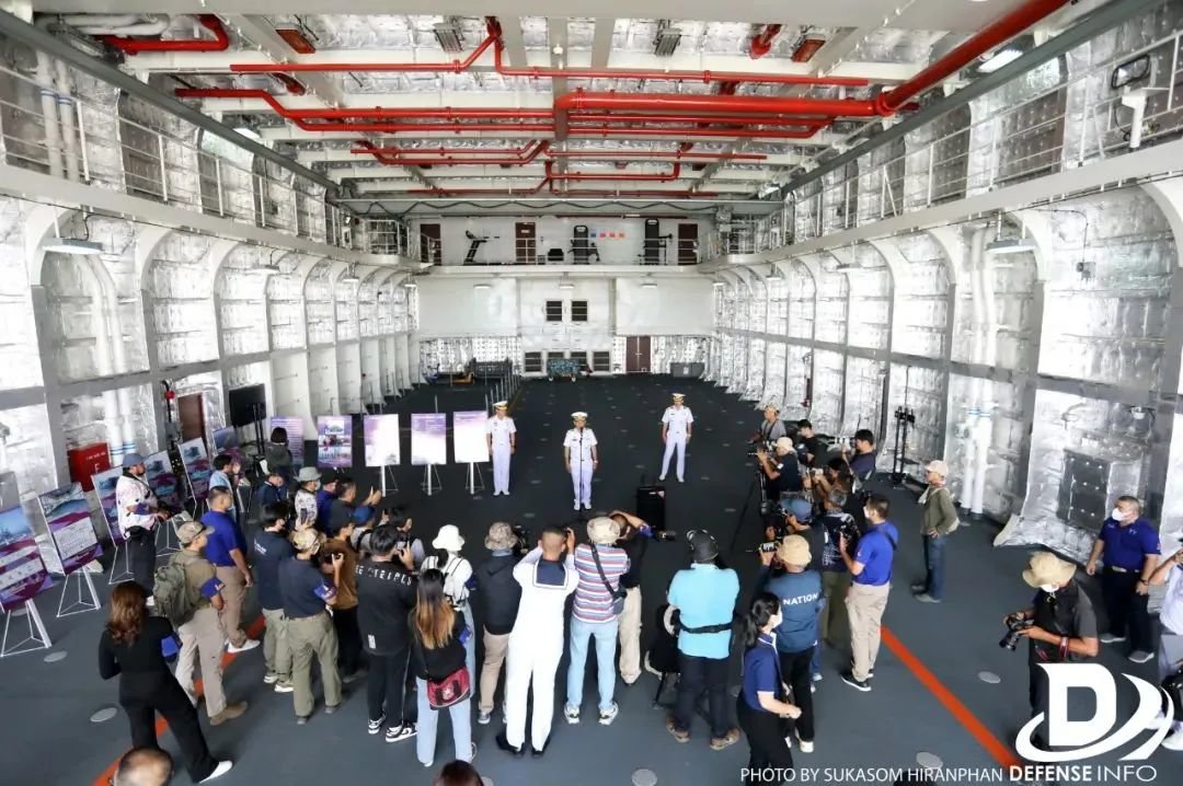 在刚刚到手的071ET型两栖船坞登陆舰“象岛”号正式服役一个月后,泰国皇家海军就又在春武里府桃梭邑港对本国媒体高度公开了这艘排水2万余吨的超大战舰。本次的公开活动中,071ET型船坞登陆舰的航海舰桥、兵舱、生活舱室、车辆甲板、泛水坞舱等悉数公开亮相,让观众们切实感受到了这艘目前中国最大外贸战舰的雄姿和细节。