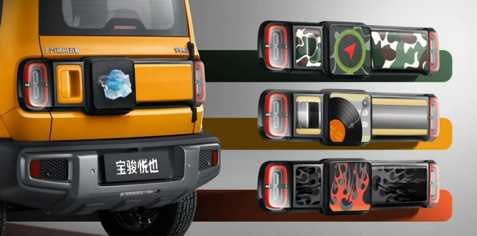 尾部与前脸设计呼应,造型设计方正,纵向布局尾灯搭配黑色后包围,显得野性十足,搭配侧开式尾门,体现该车“玩”的性质。“小书包”得到保留,这也是五菱宏光的独家特色。