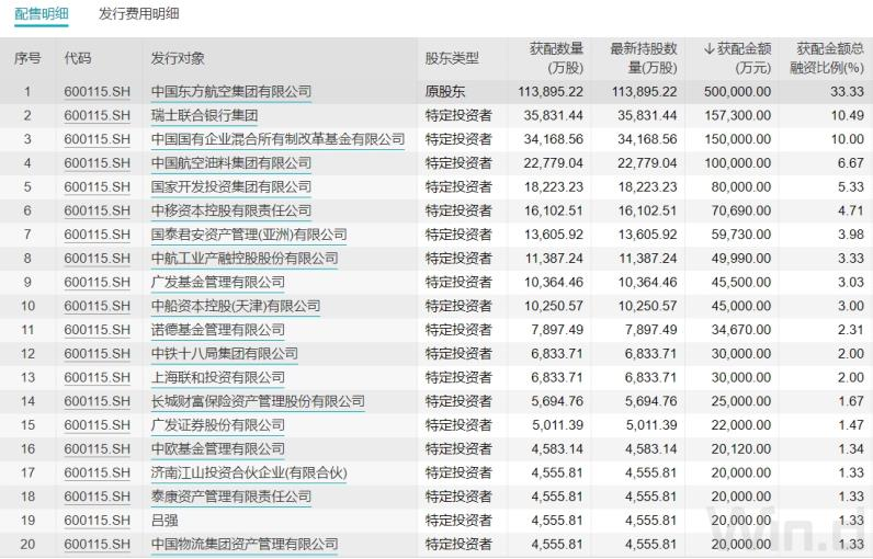 中国东航年内定增募资150亿元,在其配售明细中可以看到,瑞银集团认购35831.44万元,认购金额为15.73亿元,广发基金认购金额为4.55亿元,诺德基金认购金额为3.47亿元,中欧基金认购金额为2.01亿元。
