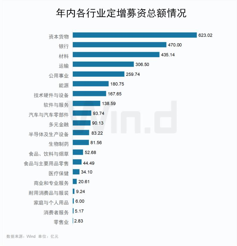 从行业分布来看,截至目前,资本货物行业年内定增募资总额为623.02亿元,占比20.06%,位居榜首。银行、材料、运输行业定增募资总额均居前列,分别为470亿元、435.14亿元、306.50亿元。