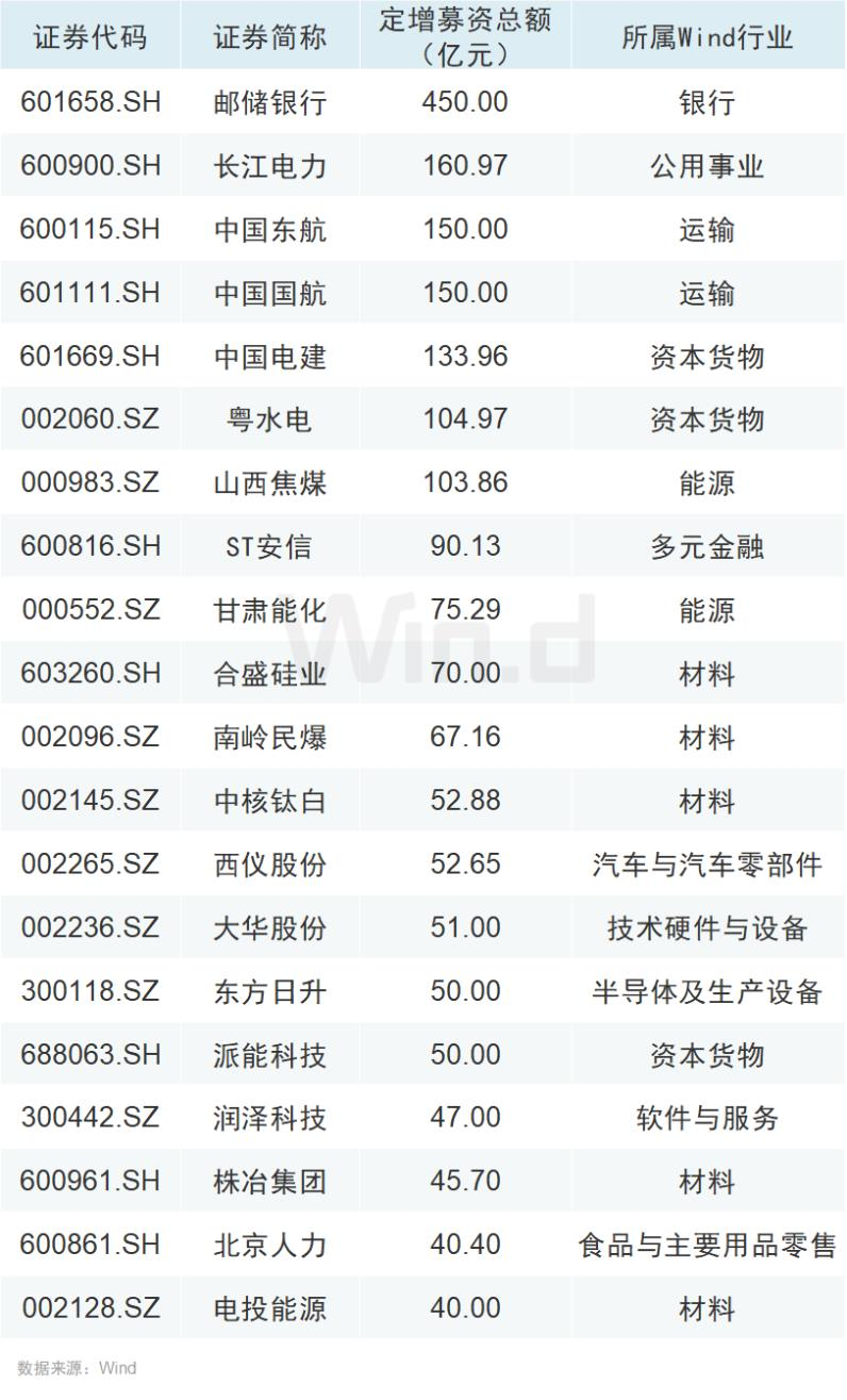 目前,邮储银行年内定增募资总额达到450亿元居首;长江电力、中国东航、中国国航、中国电建、粤水电、山西焦煤年内定增募资额均超百亿,分别为160.97亿元、150亿元、150亿元、133.96亿元、104.97亿元、103.86亿元。