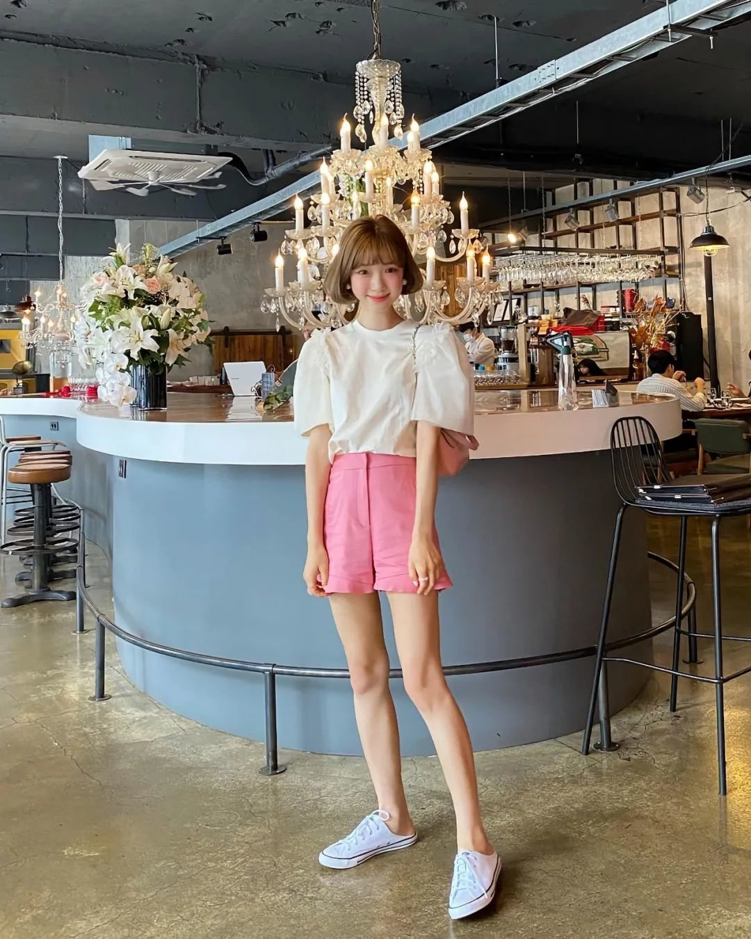姐妹们如果要学欧尼的穿法,记得里面要穿一条好看的短裤打底喔。就算露出来也不会很low,还很时髦~
