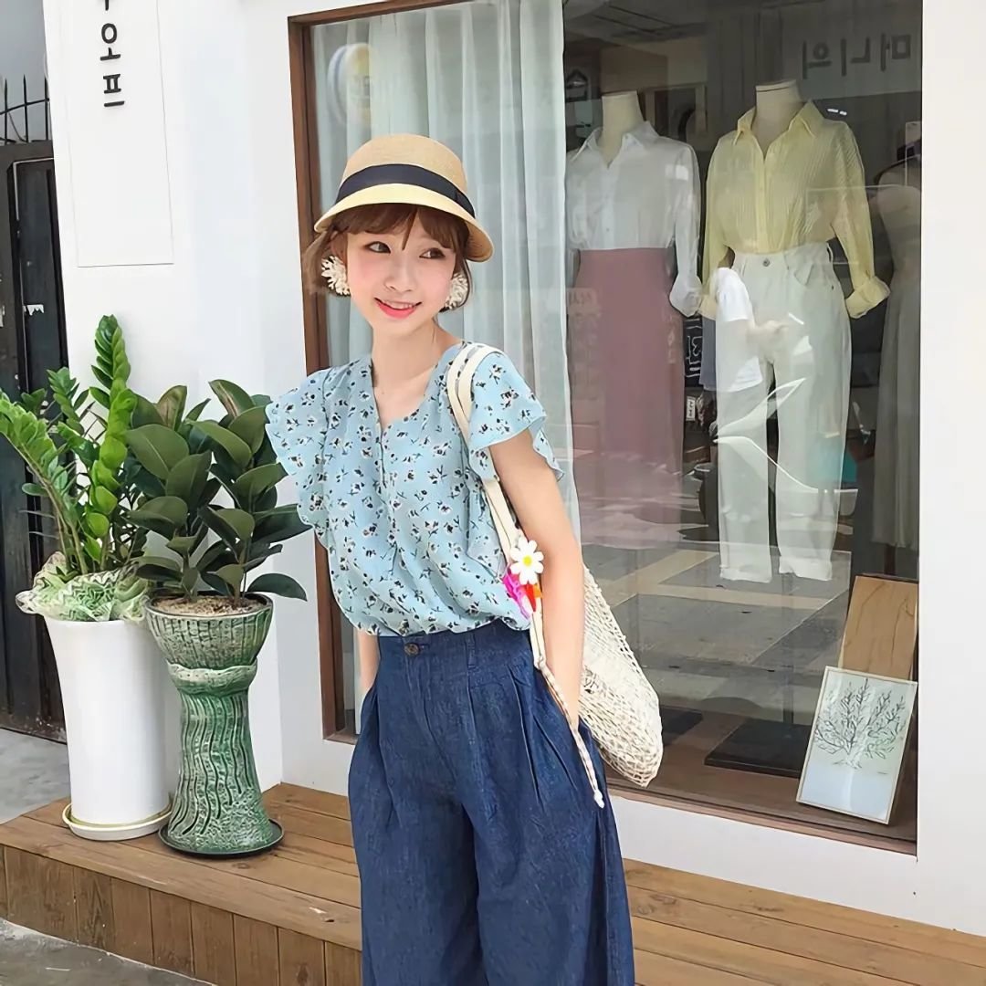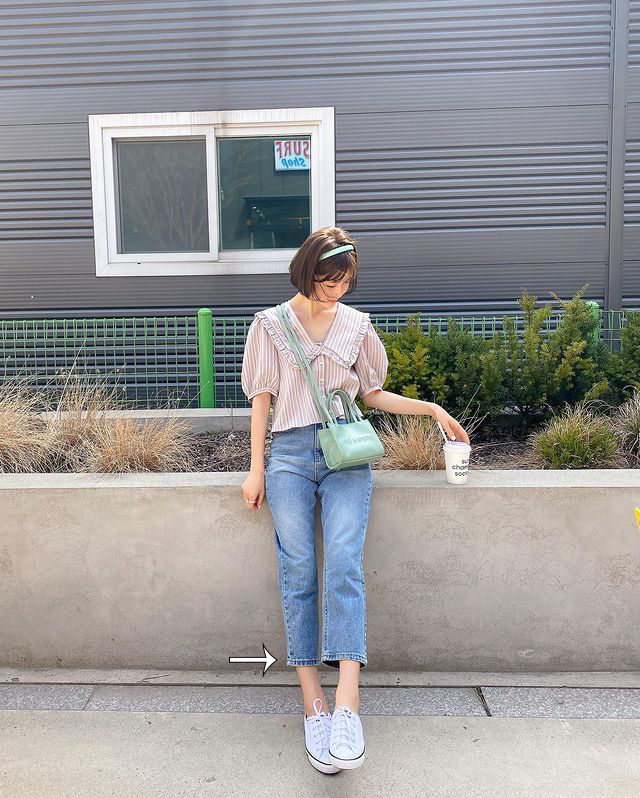 比如欧尼喜欢蓝色碎花衬衫,她就用同色系的牛仔裤来搭配,温柔可人又不会太腻。