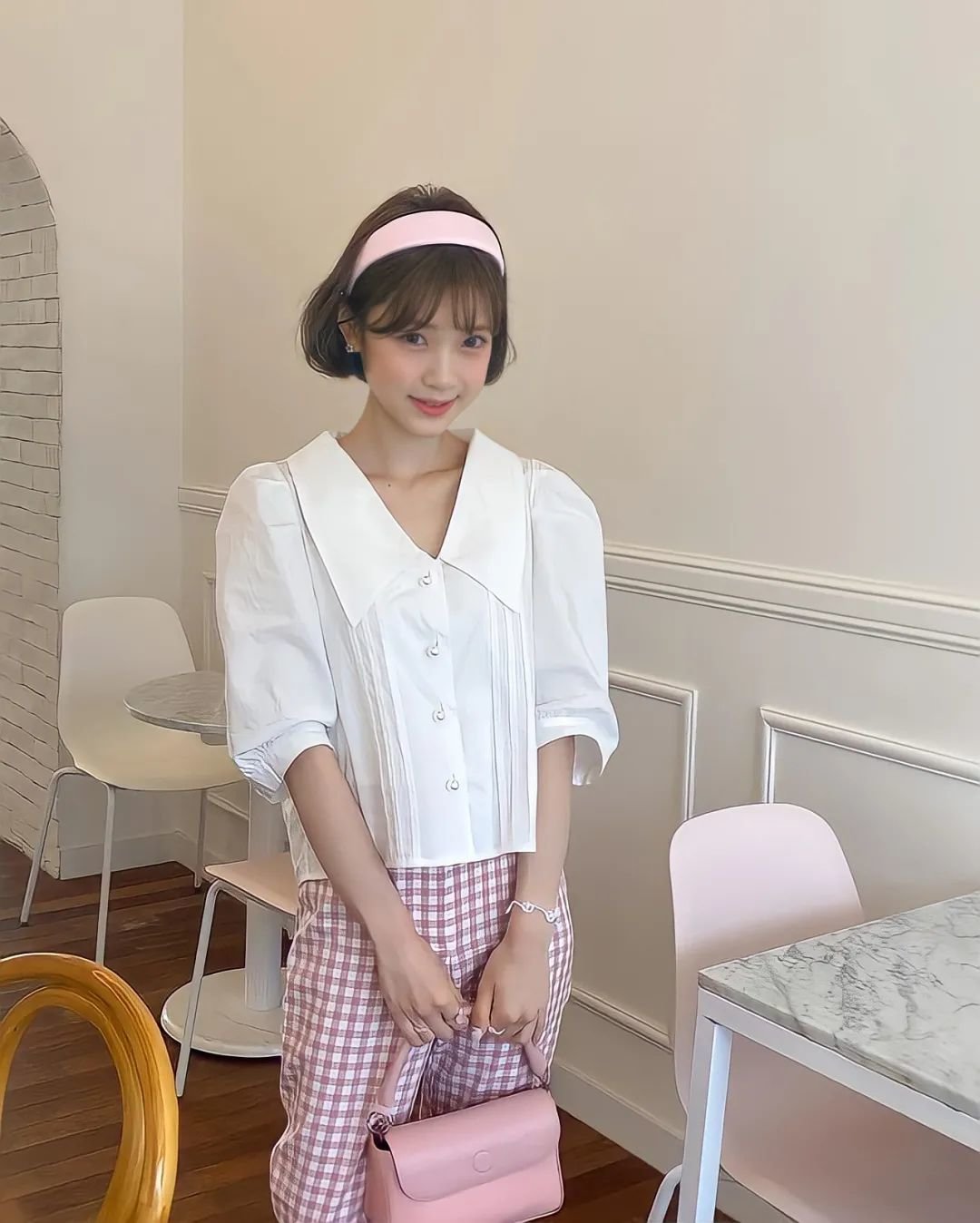 尖领白衬衫+粉色格纹裤子+少女粉发箍,粉白配色清新甜美~