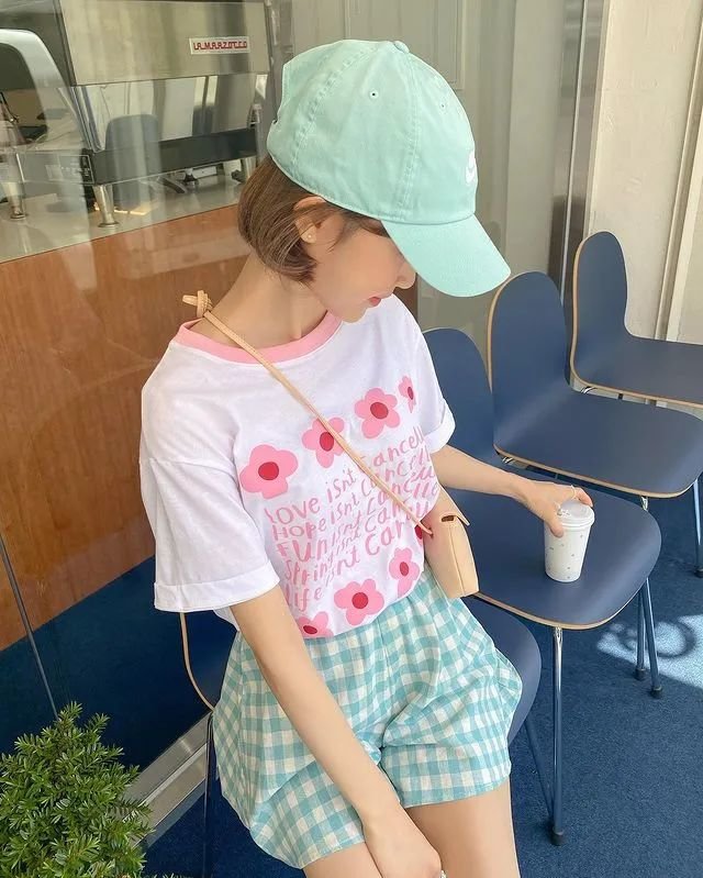欧尼是用一件花苞短裤来搭配ringer tee。T恤+短裤就是最经典的CP,塞衣角显腰线我就不多说了,姐妹们都懂的~
