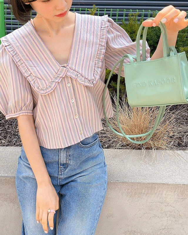 衬衫的领子是娃娃领加木耳边的设计,是向外延伸的,显脸小,拍照会很上镜喔~还可以挡住富贵包和后背的肉肉,背厚的小个子姐妹也不用担心。