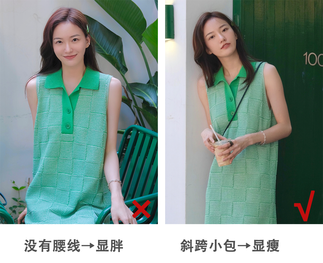 而且包带在身上形成纵向、斜向的线条,视觉上有显高、显瘦的作用。(把别人的注意力从腰转移到包带上,就算腰粗也不怕喇)