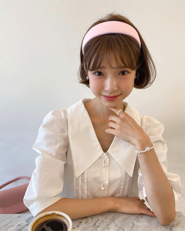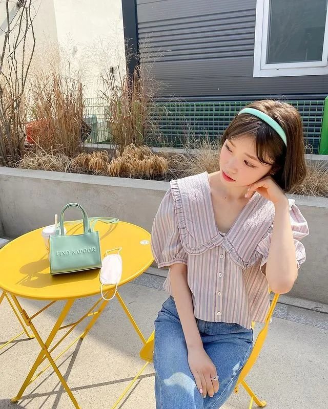 欧尼身上是一件泡泡袖的衬衫,泡泡袖给人感觉会比较俏皮可爱,不会像普通的白衬衫一样过于板正严肃。