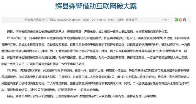 事后,河南省林业厅官网出现一篇有关闫啸天和王亚军案件的文章《辉县森警借助互联网破大案》,内容显示,“河南省辉县市森林公安局依托信息网络,经缜密部署,严密布控,成功破获一起特大非法猎捕、出售国家重点保护动物案”。