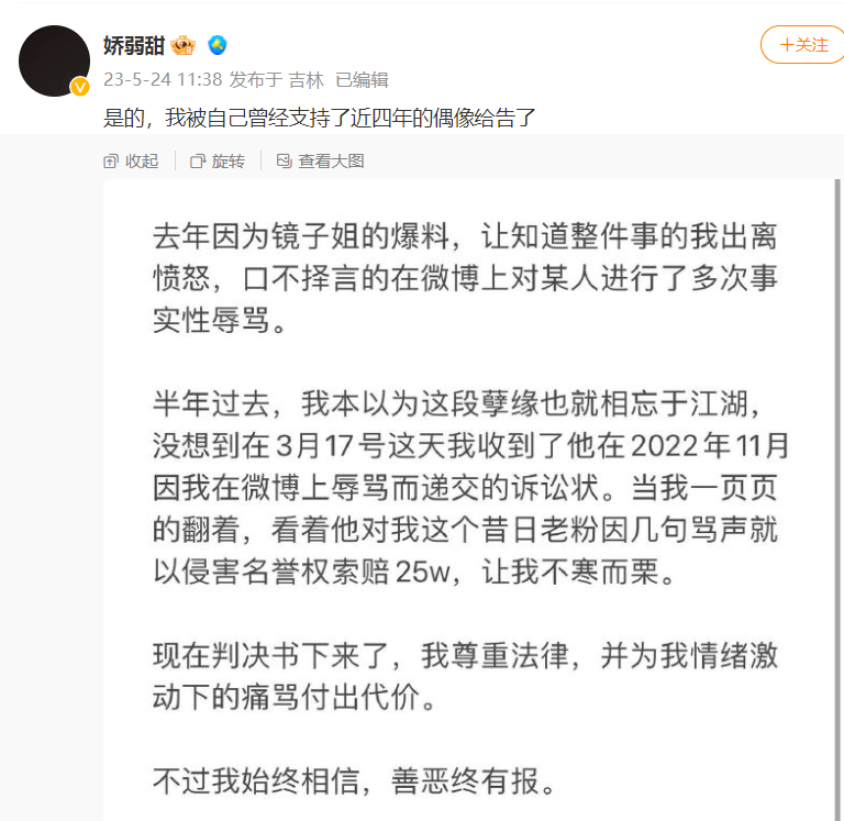 “是的,我被自己曾经支持了近四年的偶像给告了”。