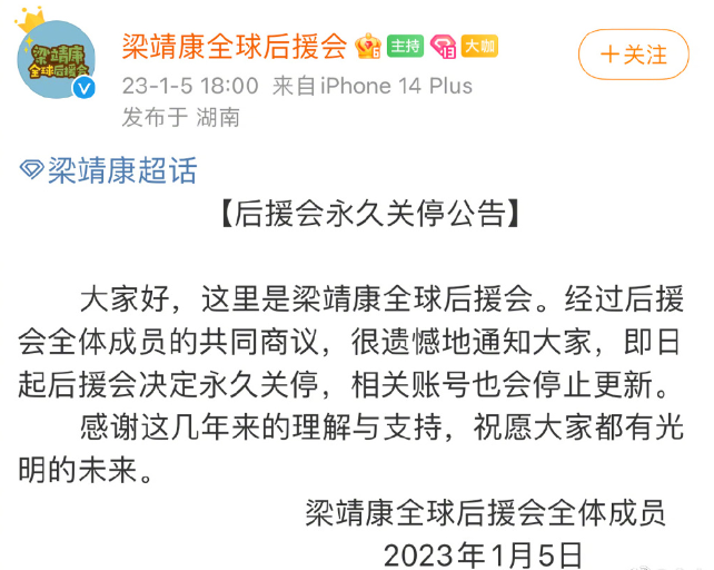 上次出现还是因为梁靖康后援会宣布永久关停。