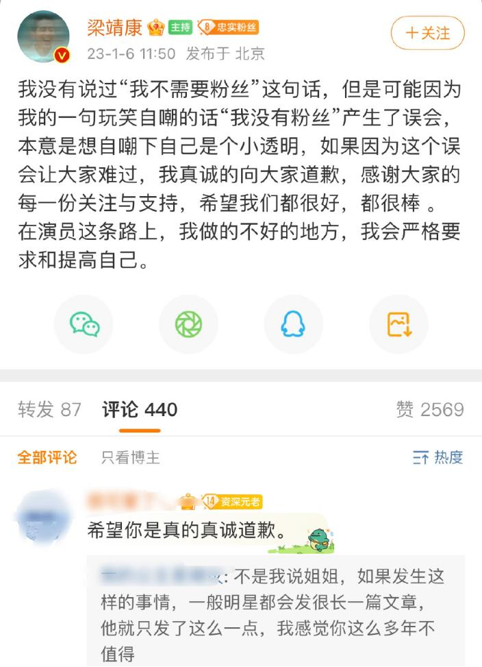 随后这条解释微博很快被删除,梁靖康再次发文祝大家各自安好。