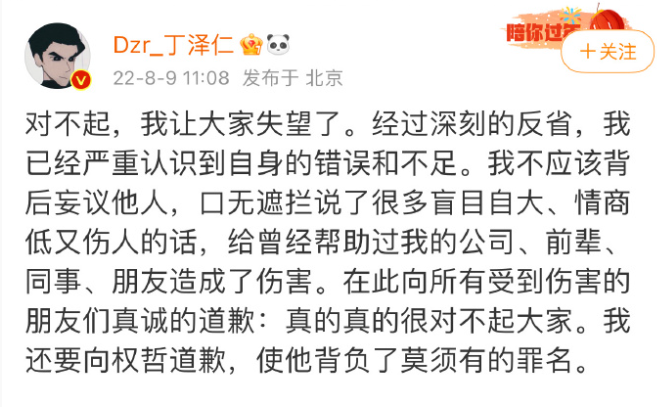 眼看舆论控制不住了,丁泽仁为了稳住事态只能发文道歉。