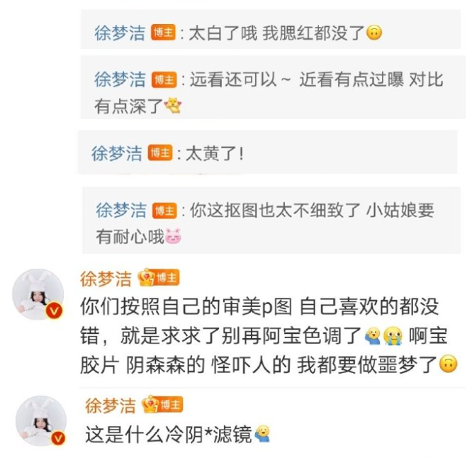 比如曾经让粉丝帮忙P图但对粉丝审美处处不满意的徐梦洁。