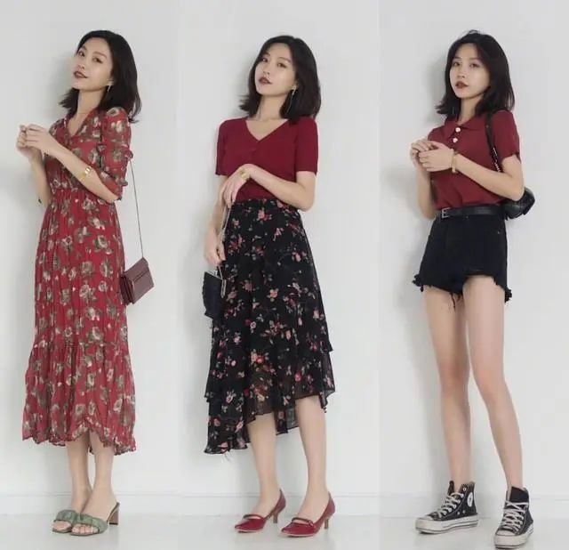 第一套的同色系搭配要点是包包的搭配,红色的碎片连衣长裙,搭配了暗红色的包包。