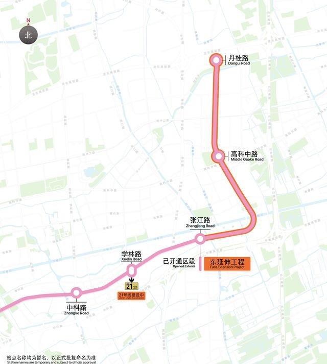 13号线东延伸工程全长4.52公里,采用地下敷设方式,起始于已建的13号线三期工程张江路东端,终于上海集成电路设计产业园,东延伸全线设两座地下车站,分别为高科中路站和丹桂路站。未来,13号线东延伸开通运营后,将为上海集成电路设计产业园及周边居民提供出行便利。同时,有助于吸引高新技术企业汇聚于集成电路产业园,促进张江科学城建设发展和上海市“科创中心”建设目标的实现,进一步改善地区出行条件、完善轨道交通网络、提高轨道交通服务水平。