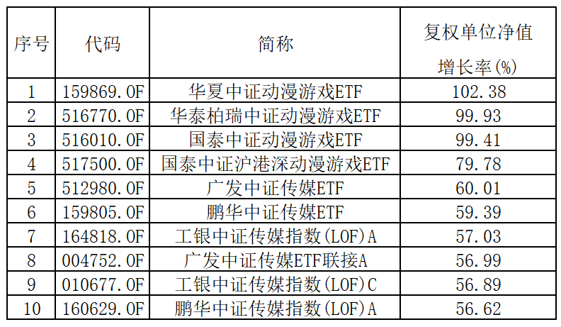 被动管理数字经济基金中,华夏中证动漫游戏ETF(159869.OF)收益率102%,是其中的第一名,也是同期全市场基金中收益率冠军。国泰旗下有两只基金处于前10榜单中。