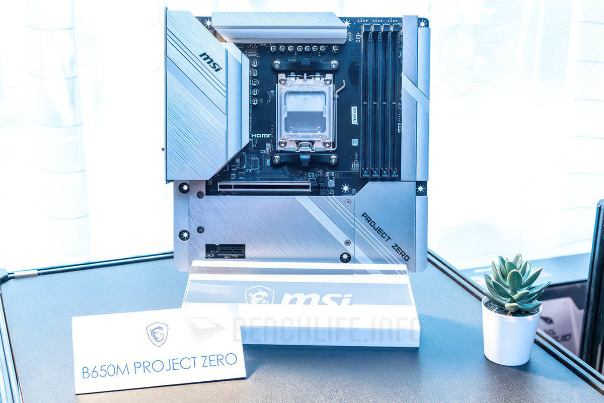 此外微星还展示了采用背插设计的B650 Project Zero,是块mATX的主板,所有接线口都被移到了主板背部,搭配对应的机箱可以更为便利的接线,而且主板正面基本都被散热装甲覆盖,视觉效果相当整洁,目测可能会有三个M.2口,但现在还不太清楚这款主板的具体规格。