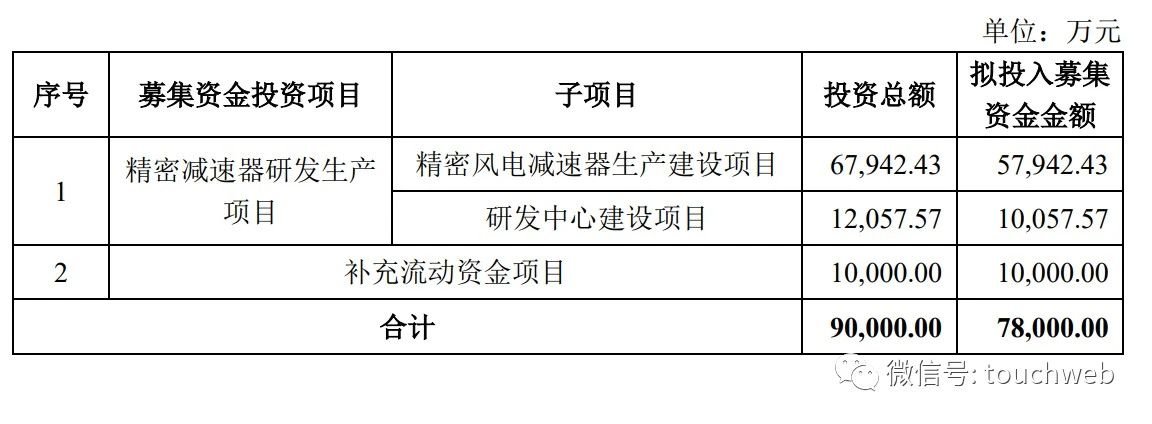 威力传动计划募资7.8亿元,其中,5.79亿元用于精密风电减速器生产建设项目,1亿元用于研发中心建设项目,1亿元用于补充流动资金项目。