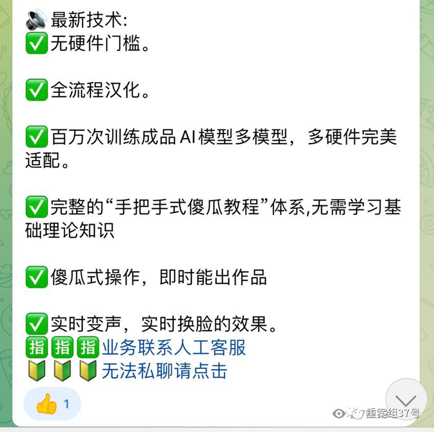 直接制作图片30美元一张,视频50美元一条。用户付款后,仅需提供一张照片或视频作为素材,一小时后便可获得处理好的影像。客服还称,购买软件后,可进入VIP专属群,享受更多AI影像资源。
