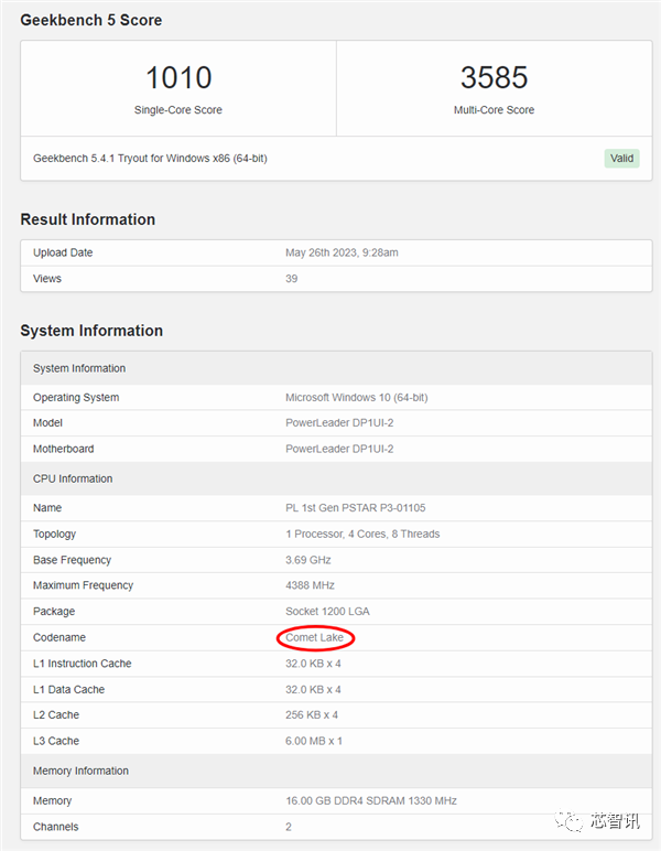 根据最新的GeekBench跑分库显示,PSTAR P3-01105其代号显示为Comet Lake处理器,采用LGA 1200插槽,以14nm工艺制造,基础频率为3.7 GHz,睿频为4.4 GHz,L3缓存为6MB,核显为UHD 630,频率为1.1 GHz,TDP为65W。